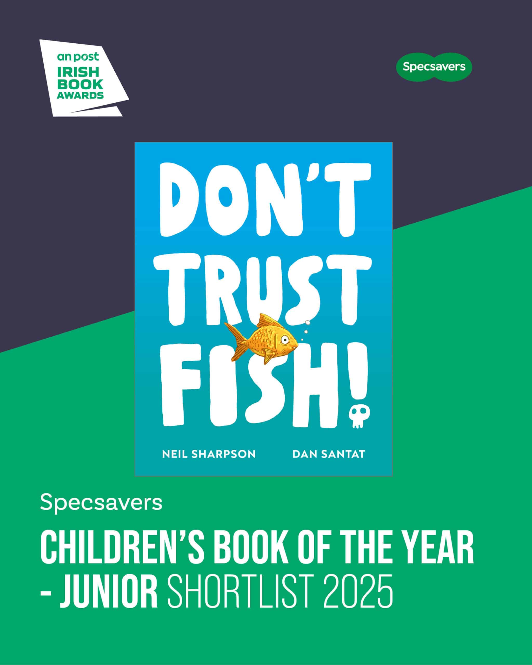 We are delighted to share the fin-tastic news that DON’T TRUST FISH! by Neil Sharpson, illustrated by Dan Santat, was shortlisted for Specsavers Children’s Book of the Year (Junior) as part of An Post Irish Book Awards 2025.